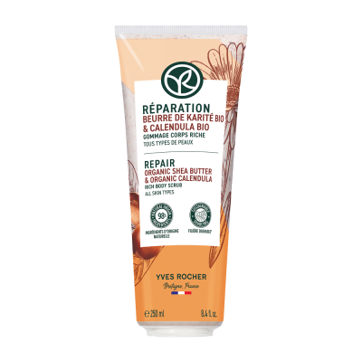 O Esfoliante de Corpo Rico, enriquecida com Manteiga e cascas de Karité, esfolia e afina o grão da pele, protegendo-a da secura.